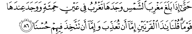Translit: Hatta itha balagha maghriba alshshamsi wajadaha taghrubu fee AAaynin hamiatin wawajada AAindaha qawman qulna ya tha alqarnayni imma an tuAAaththiba waimma an tattakhitha feehim husnan