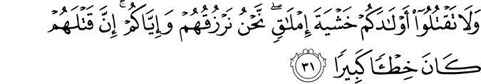 Translit: Wala taqtuloo awladakum khashyata imlaqin nahnu narzuquhum waiyyakum inna qatlahum kana khitan kabeeran