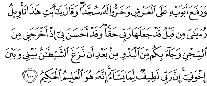 Translit: WarafaAAa abawayhi AAala alAAarshi wakharroo lahu sujjadan waqala ya abati hatha taweelu ruyaya min qablu qad jaAAalaha rabbee haqqan waqad ahsana bee ith akhrajanee mina alssijni wajaa bikum mina albadwi min baAAdi an nazagha alshshaytanu baynee wabayna ikhwatee inna rabbee
