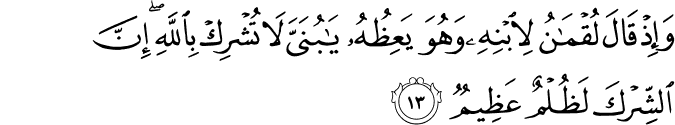 Translit: Waith qala luqmanu liibnihi wahuwa yaAAithuhu ya bunayya la tushrik biAllahi inna alshshirka lathulmun AAatheemun