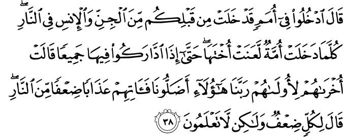 Translit: Qala odkhuloo fee omamin qad khalat min qablikum mina aljinni waalinsi fee alnnari kullama dakhalat ommatun laAAanat okhtaha hatta itha iddarakoo feeha jameeAAan qalat okhrahum lioolahum rabbana haolai adalloona faatihim AAathaban diAAfan mina alnnari qala likullin diAAfun walakin la taAAlamoona