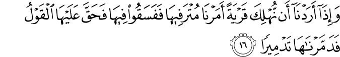 Translit: Waitha aradna an nuhlika qaryatan amarna mutrafeeha fafasaqoo feeha fahaqqa AAalayha alqawlu fadammarnaha tadmeeran