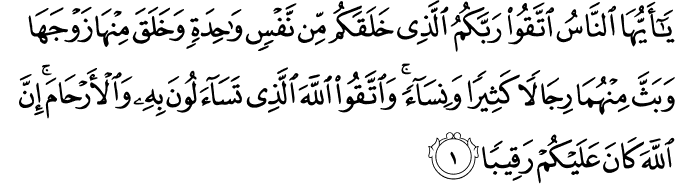 Translit: Ya ayyuha alnnasu ittaqoo rabbakumu allathee khalaqakum min nafsin wahidatin wakhalaqa minha zawjaha wabaththa minhuma rijalan katheeran wanisaan waittaqoo Allaha allathee tasaaloona bihi waalarhama inna Allaha kana AAalaykum raqeeban