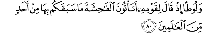 Translit: Walootan ith qala liqawmihi atatoona alfahishata ma sabaqakum biha min ahadin mina alAAalameena