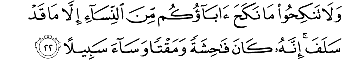 Translit: Wala tankihoo ma nakaha abaokum mina alnnisai illa ma qad salafa innahu kana fahishatan wamaqtan wasaa sabeelan