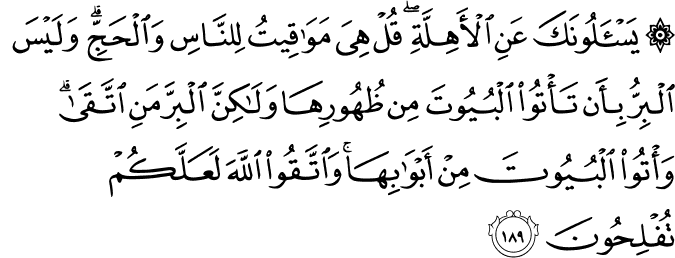 Translit: Yasaloonaka AAani alahillati qul hiya mawaqeetu lilnnasi waalhajji walaysa albirru bian tatoo albuyoota min thuhooriha walakinna albirra mani ittaqa watoo albuyoota min abwabiha waittaqoo Allaha laAAallakum tuflihoona