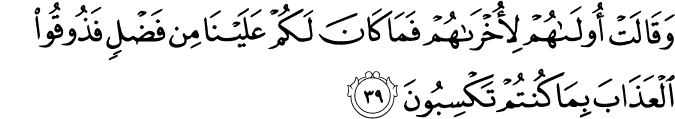Translit: Waqalat oolahum liokhrahum fama kana lakum AAalayna min fadlin fathooqoo alAAathaba bima kuntum taksiboona