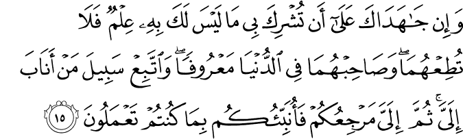 Translit: Wain jahadaka AAala an tushrika bee ma laysa laka bihi AAilmun fala tutiAAhuma wasahibhuma fee alddunya maAAroofan waittabiAA sabeela man anaba ilayya thumma ilayya marjiAAukum faonabbiokum bima kuntum taAAmaloona