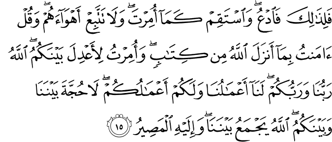 Translit: Falithalika faodAAu waistaqim kama omirta wala tattabiAA ahwaahum waqul amantu bima anzala Allahu min kitabin waomirtu liaAAdila baynakum Allahu rabbuna warabbukum lana aAAmaluna walakum aAAmalukum la hujjata baynana wabaynakumu Allahu yajmaAAu baynana wailayhi almaseeru