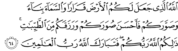 Translit: Allahu allathee jaAAala lakumu alarda qararan waalssamaa binaan wasawwarakum faahsana suwarakum warazaqakum mina alttayyibati thalikumu Allahu rabbukum fatabaraka Allahu rabbu alAAalameena