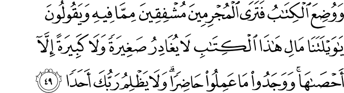 Translit: WawudiAAa alkitabu fatara almujrimeena mushfiqeena mimma feehi wayaqooloona ya waylatana ma lihatha alkitabi la yughadiru sagheeratan wala kabeeratan illa ahsaha wawajadoo ma AAamiloo hadiran wala yathlimu rabbuka ahadan