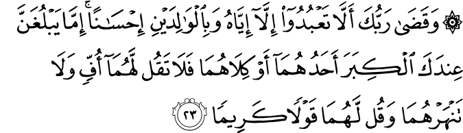 Translit: Waqada rabbuka alla taAAbudoo illa iyyahu wabialwalidayni ihsanan imma yablughanna AAindaka alkibara ahaduhuma aw kilahuma fala taqul lahuma offin wala tanharhuma waqul lahuma qawlan kareeman