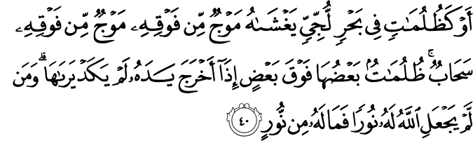 Translit: Aw kathulumatin fee bahrin lujjiyyin yaghshahu mawjun min fawqihi mawjun min fawqihi sahabun thulumatun baAAduha fawqa baAAdin itha akhraja yadahu lam yakad yaraha waman lam yajAAali Allahu lahu nooran fama lahu min noorin
