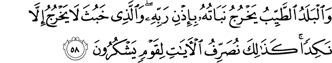 Translit: Waalbaladu alttayyibu yakhruju nabatuhu biithni rabbihi waallathee khabutha la yakhruju illa nakidan kathalika nusarrifu alayati liqawmin yashkuroona
