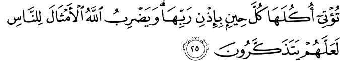 Translit: Tutee okulaha kulla heenin biithni rabbiha wayadribu Allahu alamthala lilnnasi laAAallahum yatathakkaroona