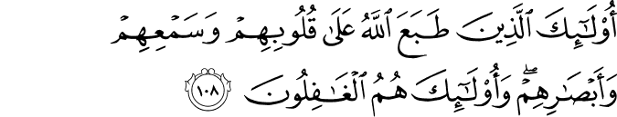 Translit: Olaika allatheena tabaAAa Allahu AAala quloobihim wasamAAihim waabsarihim waolaika humu alghafiloona