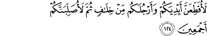 Translit: LaoqatiAAanna aydiyakum waarjulakum min khilafin thumma laosallibannakum ajmaAAeena