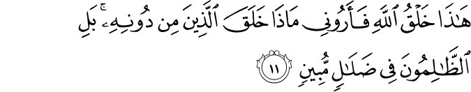 Translit: Hatha khalqu Allahi faaroonee matha khalaqa allatheena min doonihi bali alththalimoona fee dalalin mubeenin