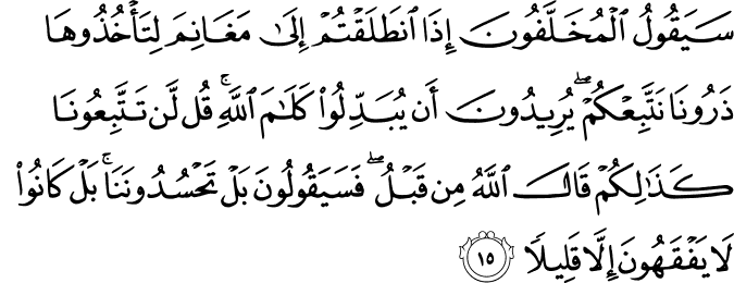 Translit: Sayaqoolu almukhallafoona itha intalaqtum ila maghanima litakhuthooha tharoona nattabiAAkum yureedoona an yubaddiloo kalama Allahi qul lan tattabiAAoona kathalikum qala Allahu min qablu fasayaqooloona bal tahsudoonana bal kanoo la yafqahoona illa qaleelan