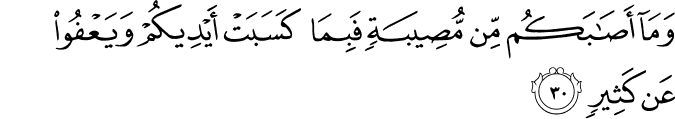 Translit: Wama asabakum min museebatin fabima kasabat aydeekum wayaAAfoo AAan katheerin