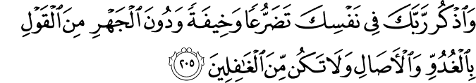 Translit: Waothkur rabbaka fee nafsika tadarruAAan wakheefatan wadoona aljahri mina alqawli bialghuduwwi waalasali wala takun mina alghafileena