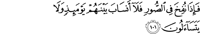 Translit: Faitha nufikha fee alssoori fala ansaba baynahum yawmaithin wala yatasaaloona