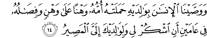 Translit: Wawassayna alinsana biwalidayhi hamalathu ommuhu wahnan AAala wahnin wafisaluhu fee AAamayni ani oshkur lee waliwalidayka ilayya almaseeru