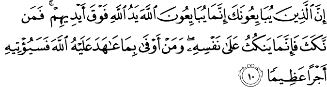 Translit: Inna allatheena yubayiAAoonaka innama yubayiAAoona Allaha yadu Allahi fawqa aydeehim faman nakatha fainnama yankuthu AAala nafsihi waman awfa bima AAahada AAalayhu Allaha fasayuteehi ajran AAatheeman